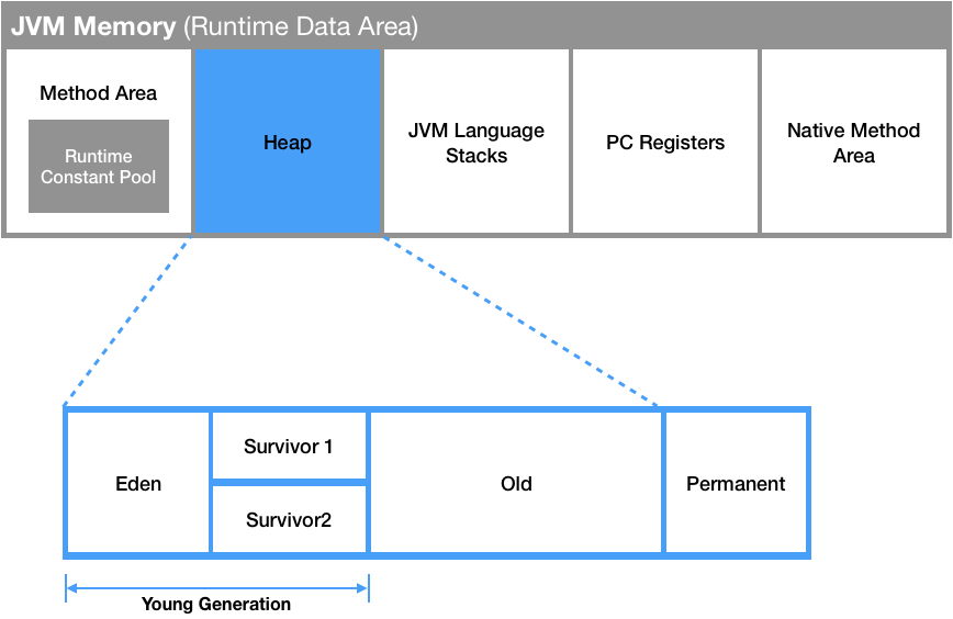 -Eden : new 를 통해 새로 생성된 객체가 위치함. 정기적인 쓰레기 수집 후 살아남은 객체들은 Survivor로 이동한다.