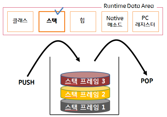 int, long, boolean등 기본 자료형을 생성할때 저장하는 공간, 임시적으로 사용되는 변수나 정보들이 저장되는 영역이다.