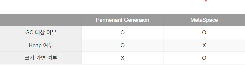 - Java 8 이후 Metaspace로 대체되어 Heap영역에서 제외되었다
